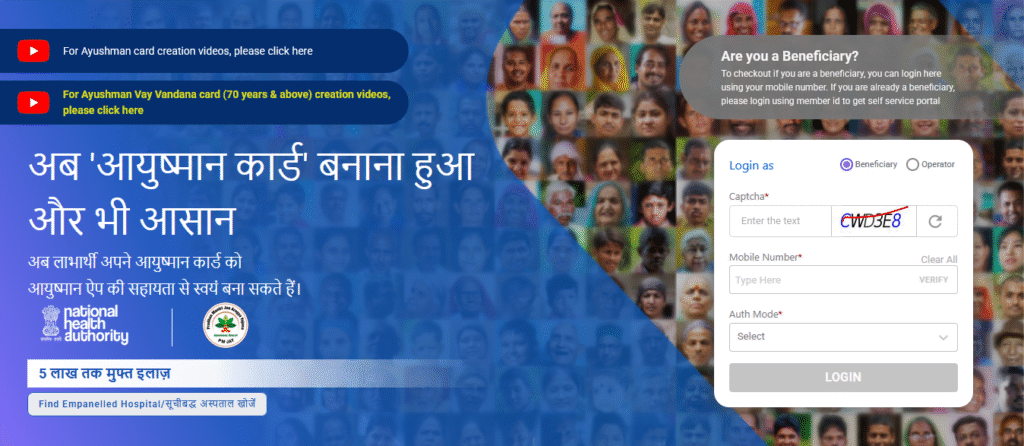 लॉगिन ऑप्शन पर क्लिक करें और Beneficiary चुनें (Operator नहीं)। अब उस मोबाइल नंबर को डालें जो PMJAY में रजिस्टर है। आवश्यक होने पर OTP वेरिफिकेशन पूरा करें।