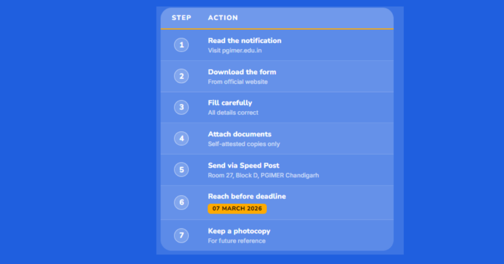 Practical tip for Maker/Siwan candidates: Send your application by Speed Post from the Siwan Head Post Office, not a local sub-post office, to ensure trackability. Keep your postal receipt. PGIMER receives applications from all over India and the competition for 1 post is real — so your documents should be immaculate, printed cleanly, self-attested on every page, and sent well before the deadline.