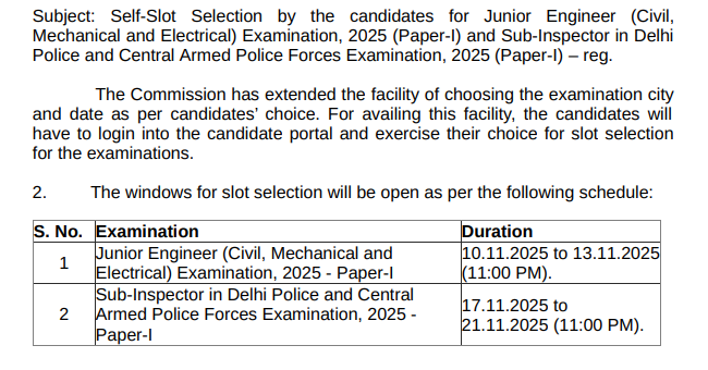 SSC JE Self Slot Selection 2025 – Highlights